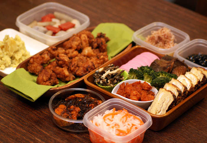 御節は、お重とかないので、四角い入れ物で揃えてみました・・・