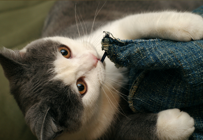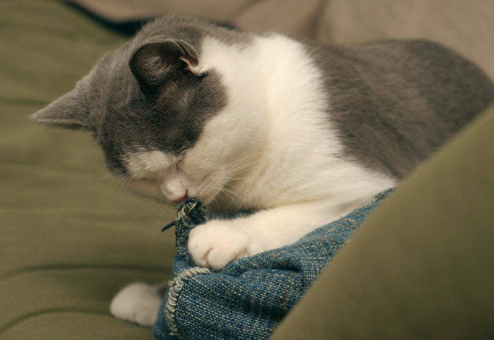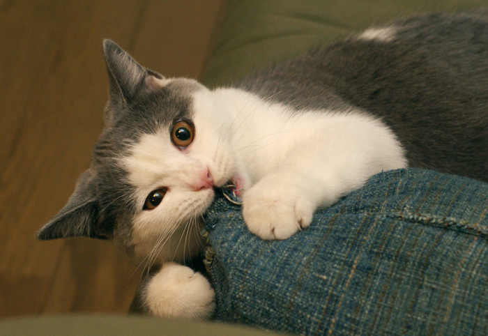 何かの拍子に横にあるクッションの角っこにじゃれ、噛み散らかす・・・